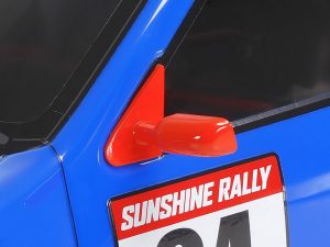↑ドアミラーとルーフ後端に装着された独立タイプのリアウィングはABS樹脂製の別パーツ構成としてディテールを引き締める。ブルーのボディに赤のパーツがアクセントとして映える。