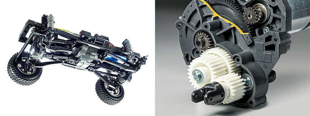 部分的に金属パーツで補強したラダーフレームのシャーシに前後とも4リンクリジットサスペンションで本格クロカン仕様に仕上げられているCC-02シャーシを採用。付属ギアの組み換えのほか、別売ギアで20種類の幅広いギア比でのセッティングが可能。
