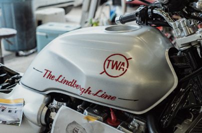 このステッカーは、所さんが新しく購入したCBに実際に貼っているものと同じデザイン。航空機メーカーをモチーフにした「The Lindbergh Line」のロゴは、ガレージの雰囲気や愛車を一段と引き立ててくれること間違いなしです。