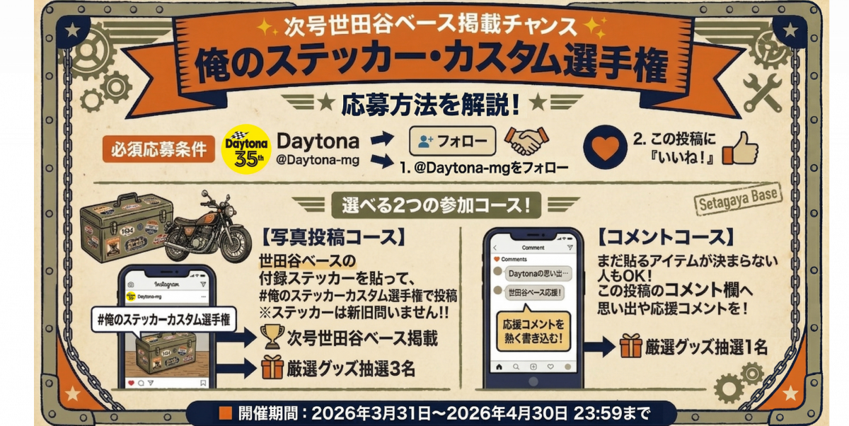 「ステッカーは持ってるけど、もったいなくてまだ貼れない…」なんて人もご安心を。Instagramの該当投稿に、Daytonaや世田谷ベースへの熱い思い、応援メッセージをコメントするだけで応募できるコースも同時開催中! こちらも抽選で1名様に厳選グッズが当たっちゃうぞ。